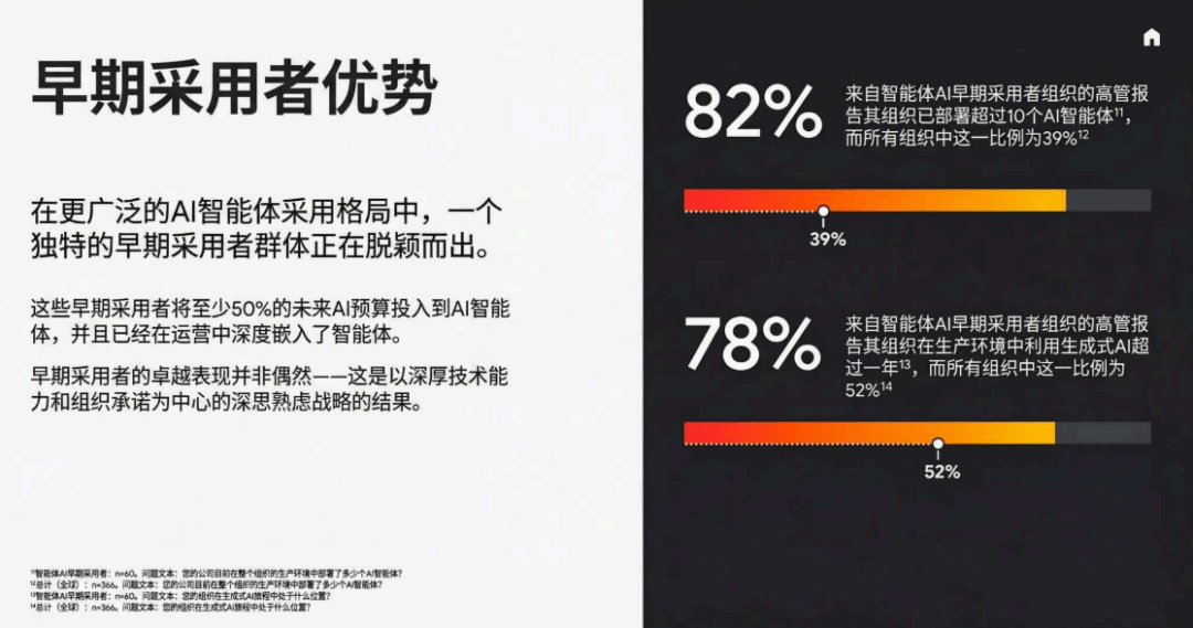 晚期采用者能正在所有跨行业智能体用例中实现投资报答,而AI智能体的呈现,52%的企业已正在出产摆设AI智能体,客户办事智能体已成为标配,晚期采用者正收成显著的先发盈利,实现“3天快速交付”,实现AI的跨部分协同。AI的贸易价值?